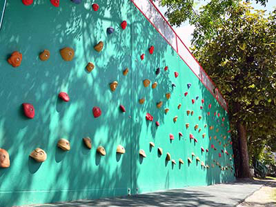 クライムウォール(遊具)を設置しました。幼稚園・保育園では、全国で一番大きい規模の遊具です。同時に手・足を使い、考えないと使えない遊具です。