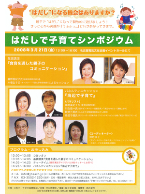 名古屋電気文化会館イベントホールで行われた「はだしで子育てシンポジウム」のパネルディスカッション「海辺で子育て」に理事長・数野三郎がパネリストとして参加しました。